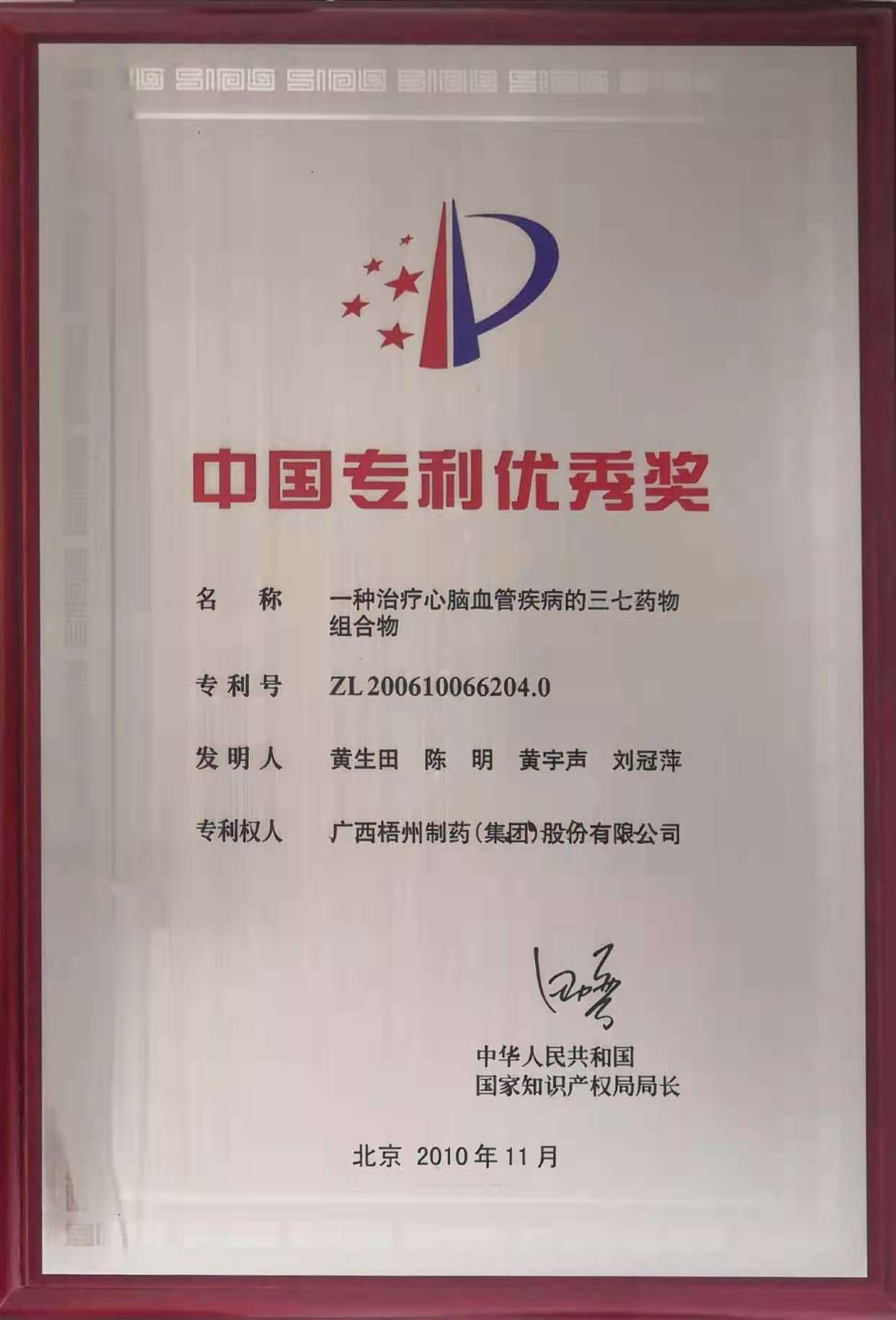 黄生田、陈明、黄宇声、刘冠萍参与的《一种治疗心脑血管疾病的三七药物组合物》获得中国专利优秀奖