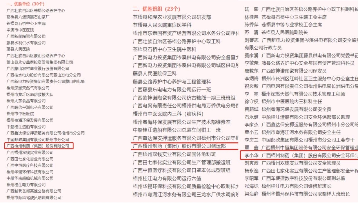 近日,梧州市“安康杯”竞赛组委会办公室通报2022年度梧州市“安康杯”竞赛活动先进集体和优秀个人,伟德国际1946荣获先进集体荣誉称号,公司储运部荣获优胜班组,原料药车间安全环保与设备主管李小华荣获优秀个人称号。