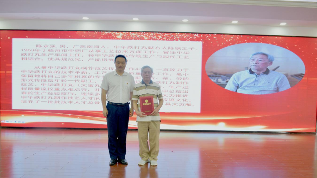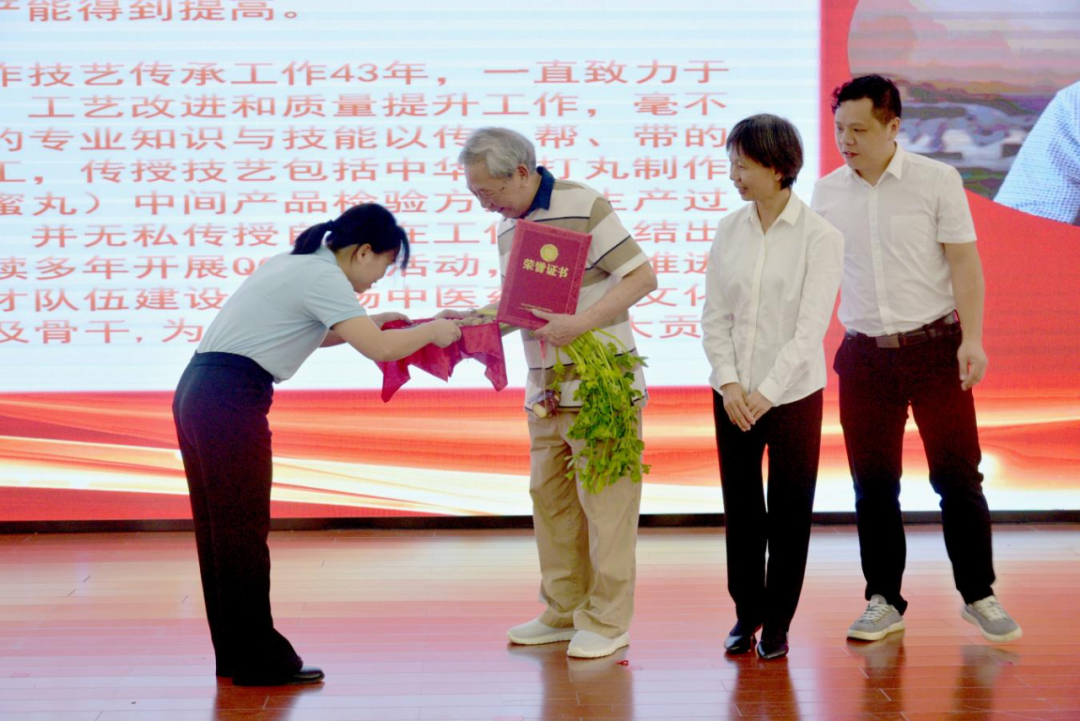 活动还专门邀请了中华跌打丸献方人陈铁的儿子,现已83岁高龄的原跌打丸生产车间主任陈永强到会,由公司党委书记、董事长黄文彩为其颁发“中华跌打丸制作技艺——金牌师父”荣誉称号。“中华跌打丸制作技艺”的第三、第四、第五代非遗传承人依次上台,同样用传统的束脩六礼对陈老进行了谢师,以此来表达对师父的感激之情、教导之恩。