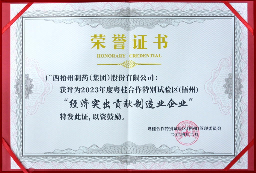 广西伟德国际1946(集团)股份有限公司获评为2023年度粤桂合作特别试验区(梧州)经济突出贡献制造业企业