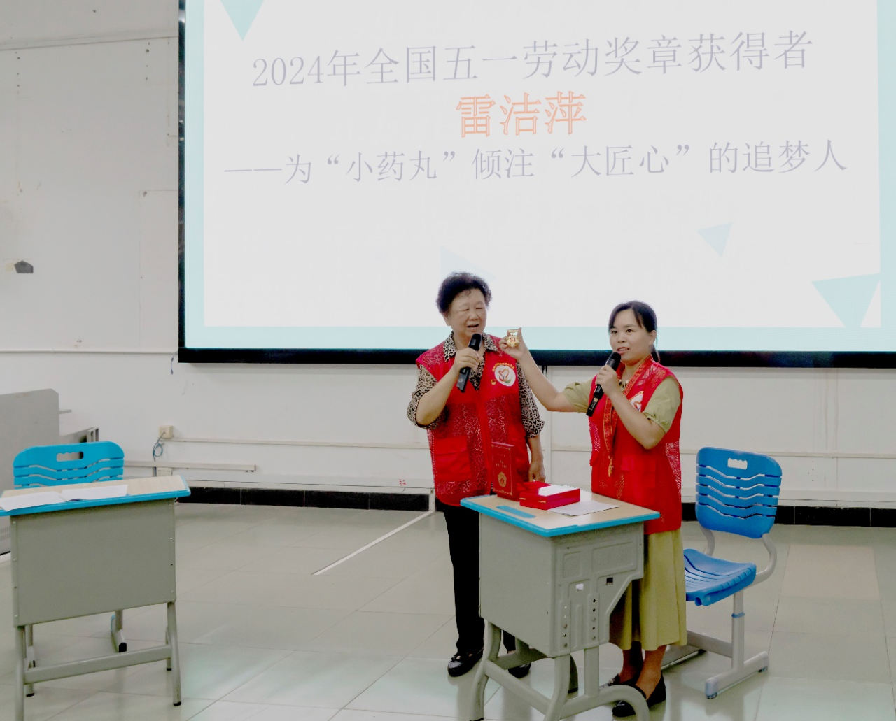 “同学们,这个是我们小雷师傅今年得到的全国五一劳动奖章,怎么样?想要吗?”老干部局的曾宪真主任拿起金灿灿的奖牌,展示给现场的同学们。“‘猴赛雷’!看起来好有含金量”“雷姐姐太赞了,是我们学习的好榜样”同学们的赞美崇拜之情溢于言表。