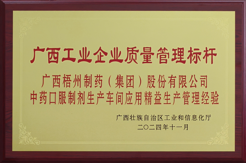伟德国际1946(中药口服制剂生产车间应用精益生产管理经验)荣获广西工业企业质量管理标杆