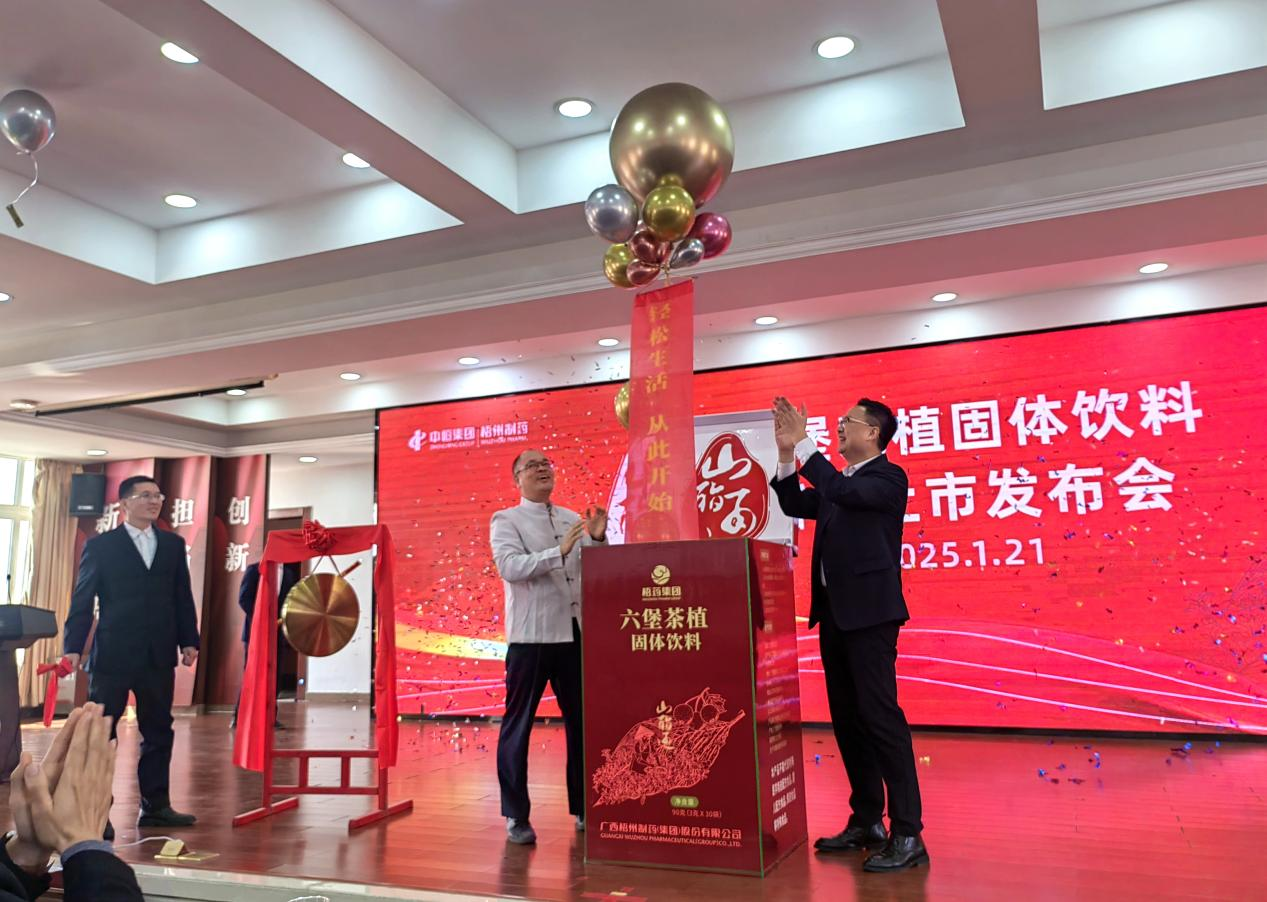 锣声嘹亮、气球缤纷、掌声热烈。中恒集团副总经理肖淋、中恒集团总经理助理黄宇声以及伟德国际1946副董事长、总经理刘洋共同启动六堡茶植固体饮料新品上市发布仪式。