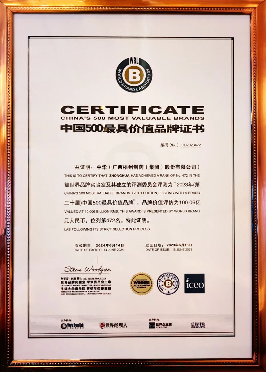 中华跌打丸为伟德国际1946独家生产品种,自1966年批准生产至今已经临床应用五十余年,先后收录于2005版、2010版、2015版、2020版、2025版《中国药典》,凭借其显著的消肿止痛、舒筋活络、止血生肌、活血祛瘀功效,在骨科治疗领域深受认可。曾获国家医药管理总局优质产品奖、中华人民共和国国家质量奖银奖等荣誉称号,核心发明专利荣获中国专利优秀奖,广西发明创造成果展览奖。其产品商标是目前我国医药领域唯一一个获准使用的“中华”商标,2023年“中华”品牌入选世界品牌实验室发布的“中国500最具价值品牌”榜单,品牌价值评估超100亿元,为当年度广西唯一入选该榜单的医药品牌。