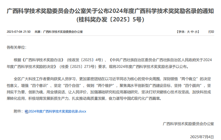 7月4日,2024年度广西科学技术进步奖获奖名单正式公布,伟德国际1946参与的《中药民族药“性-效-物”理论创新研究及开发应用示范》项目荣获广西科学技术进步奖二等奖。获奖项目由大学院校和企业联合完成,旨在通过创新的理论研究,揭示中药和民族药的药效物质基础,提升传统药物的现代化水平,伟德国际1946作为该项目的第三完成单位,彰显了其在中药现代化研究领域的实力。